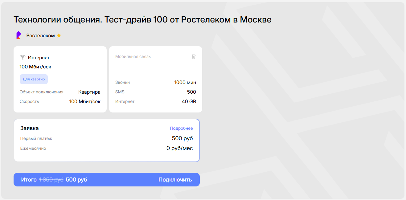 Тариф подходит для повседневного использования дома, обеспечивает стабильный просмотр фильмов и передач в HD, комфортную работу и общение онлайн каждый день без задержек.