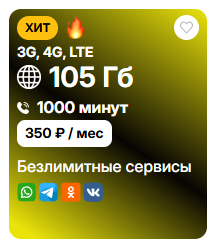 Для доступа в сеть предоставляется 105 ГБ мобильного интернета. После окончания пакета трафик остается безлимитным, но со сниженной скоростью, что удобно для мессенджеров и почты.