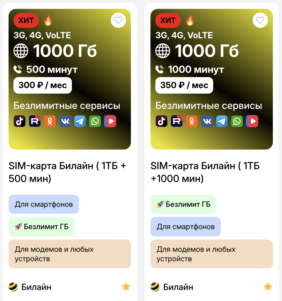 - «билайн» предоставляет абонентам как полноценный «безлимит», так и варианты с очень большим объемом трафика, которые практически не уступают полностью безлимитным предложениям.